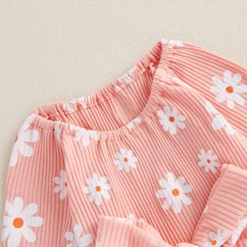 Baby Girl Ribbed Romper Dress - Floral Print, Bell Sleeve Bodysuit with Bow Waistband